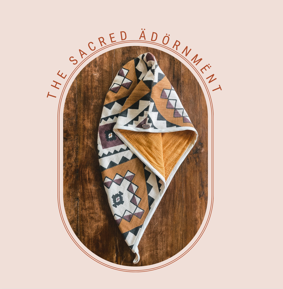 SACRED HAIR WRAP. HAND MADE WITH LOVE AND ORGANIC MATERIALS. BLESSED WITH SACRED AFFIRMATIONS.